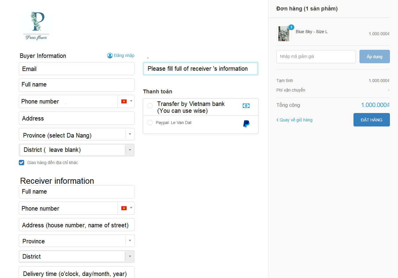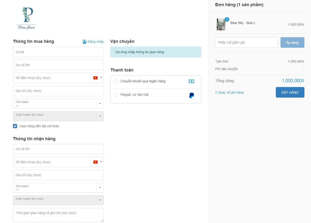 Bước 4: Điền các thông tin của bạn để nhận đơn hàng, lựa chọn hình thức thanh toán và vận chuyển cho đơn hàng của mình